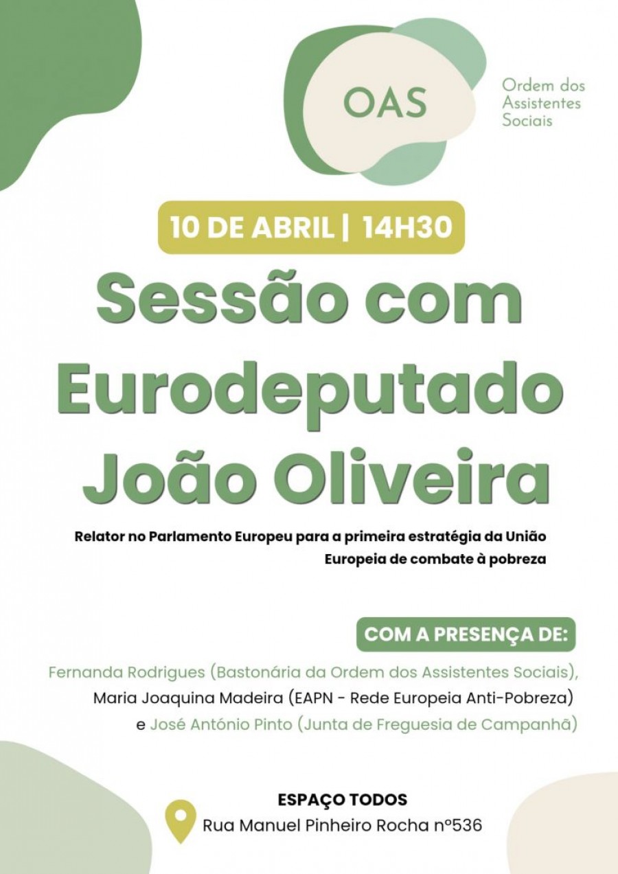 Numa iniciativa da Ordem dos Assistentes Sociais - Núcleo Territorial OAS Norte, realiza-se no dia 10 de abril de 2026 pelas 14:30 h, no ESPAÇO TODOS | Rua Manuel Pinheiro Rocha n.º 536 | Porto, uma sessão com o eurodeputado João Oliveira, relator da estratégia da União Europeia de combate à pobreza.